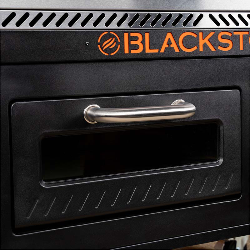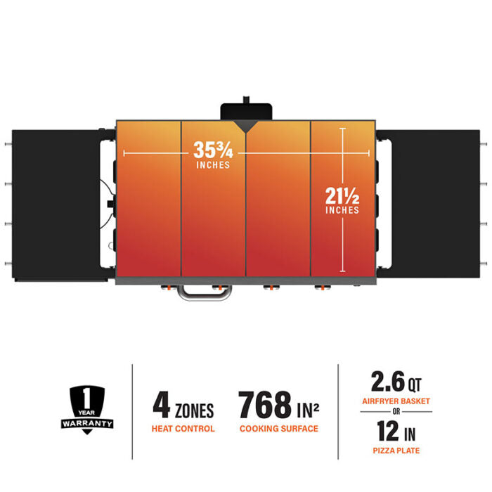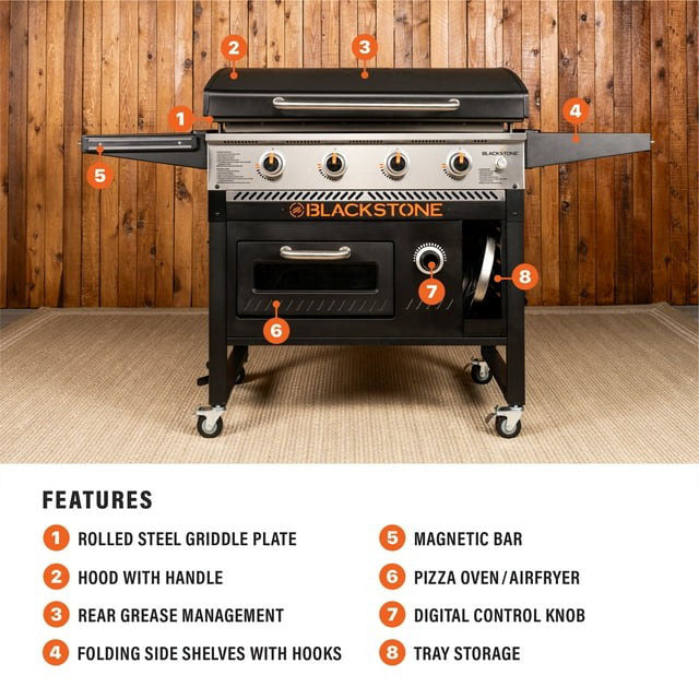 Whether you are planning a barbeque, pizza party, or just want to make a nice outdoor meal, the Blackstone 4-Burner 36” Propane Griddle with Pizza Oven and Air Fryer has what you need. A 36” griddle top and a built-in pizza oven that doubles as an air fryer allow you to make burgers, ribs, chicken nuggets, fries, pizza, or whatever your current craving is. Four independently heated burners and a combined 768 sq. in. cooking area provide room to make different dishes simultaneously. Spacious side shelves with tool hooks and a magnetic tool bar give you ample prep space and provide a place to keep your tools handy during cooking. Fold the shelves down after use for more compact storage. The side storage compartment is designed to keep serving and baking trays handy. Efficiently cook all your favorites in one place with this griddle setup, so you can enjoy more time eating and making memories with family and friends.
