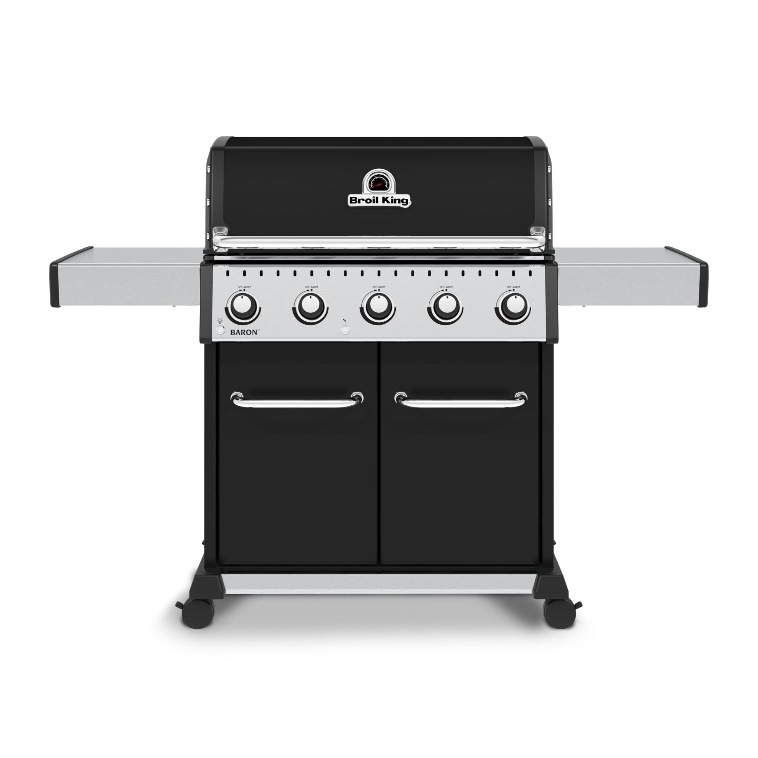 The Broil King® Baron™ 500 PRO Series features 570 sq. in. primary cooking surface and includes a durable cast aluminum oven, 5 stainless steel Dual-Tube™ burners, illuminated control panel lights, stainless steel 8mm rod cooking grids, stainless steel warming rack, stainless steel Flav-R-Wave™ cooking system, electronic ignition, stainless steel drop-down side shelves and enclosed black cabinet base.