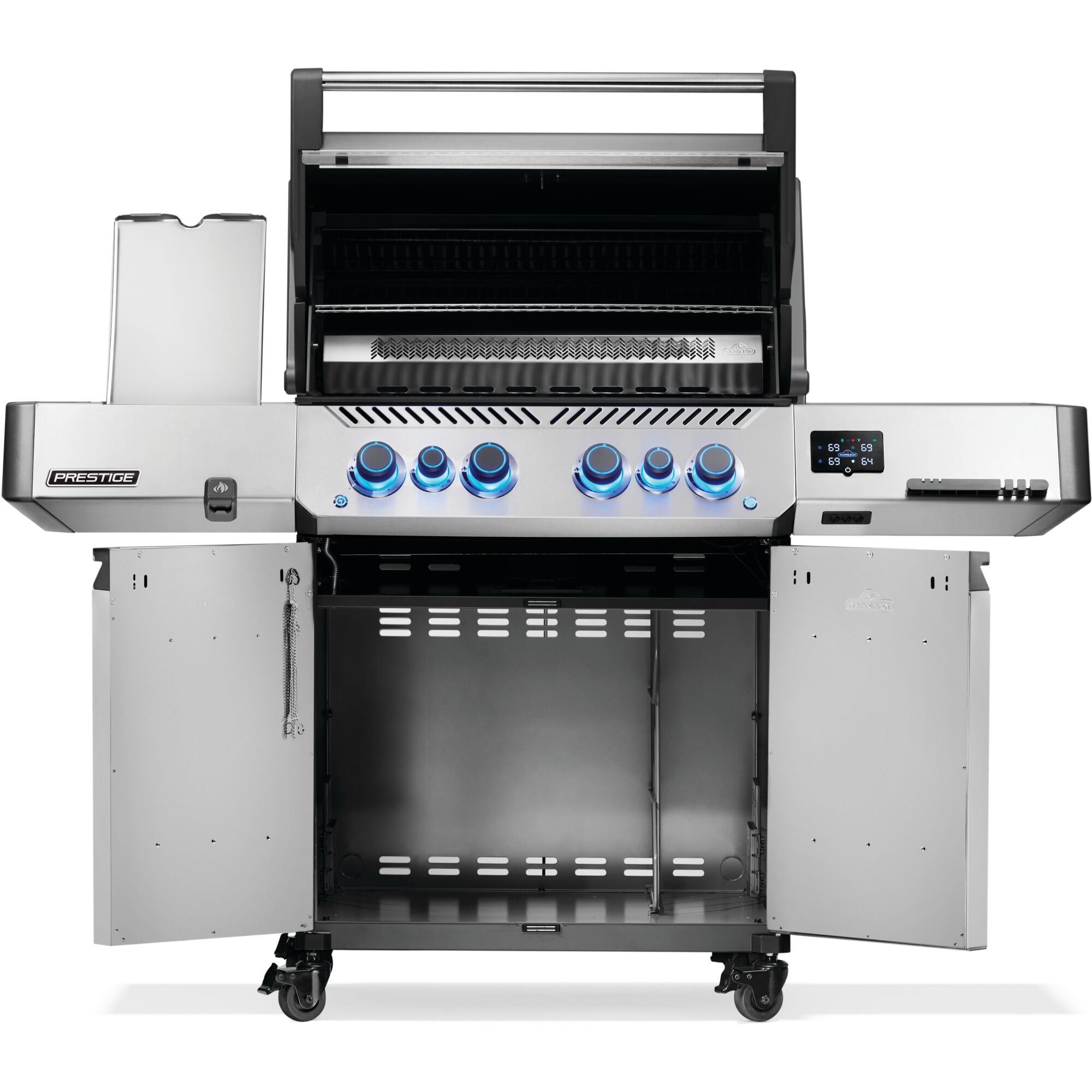 The stainless steel Prestige 500 Connected Gas Grill with Infrared Side and Rear Burner is a dynamic evolution in grilling, featuring Wi-Fi and Bluetooth connectivity that brings you closer to your grilling experience than ever before. Monitor temperatures, set timers, get cook assistance, and receive high-temperature warnings—all from your smartphone. With included temperature probes and an integrated LCD display, you’ll always know exactly what’s happening inside your grill. A larger rotisserie burner and infrared sear station, side burner provide enhanced performance. LED Control Knobs illuminate for nighttime entertaining and feature SafetyGlow™, glowing red for added safety when the gas is on. The stow-away warming rack keeps things tidy, and hidden tool hooks provide extra prep space. Enjoy new ways to experience connected living and unique cooking methods with the compelling Prestige 500 Connected Gas Grill.