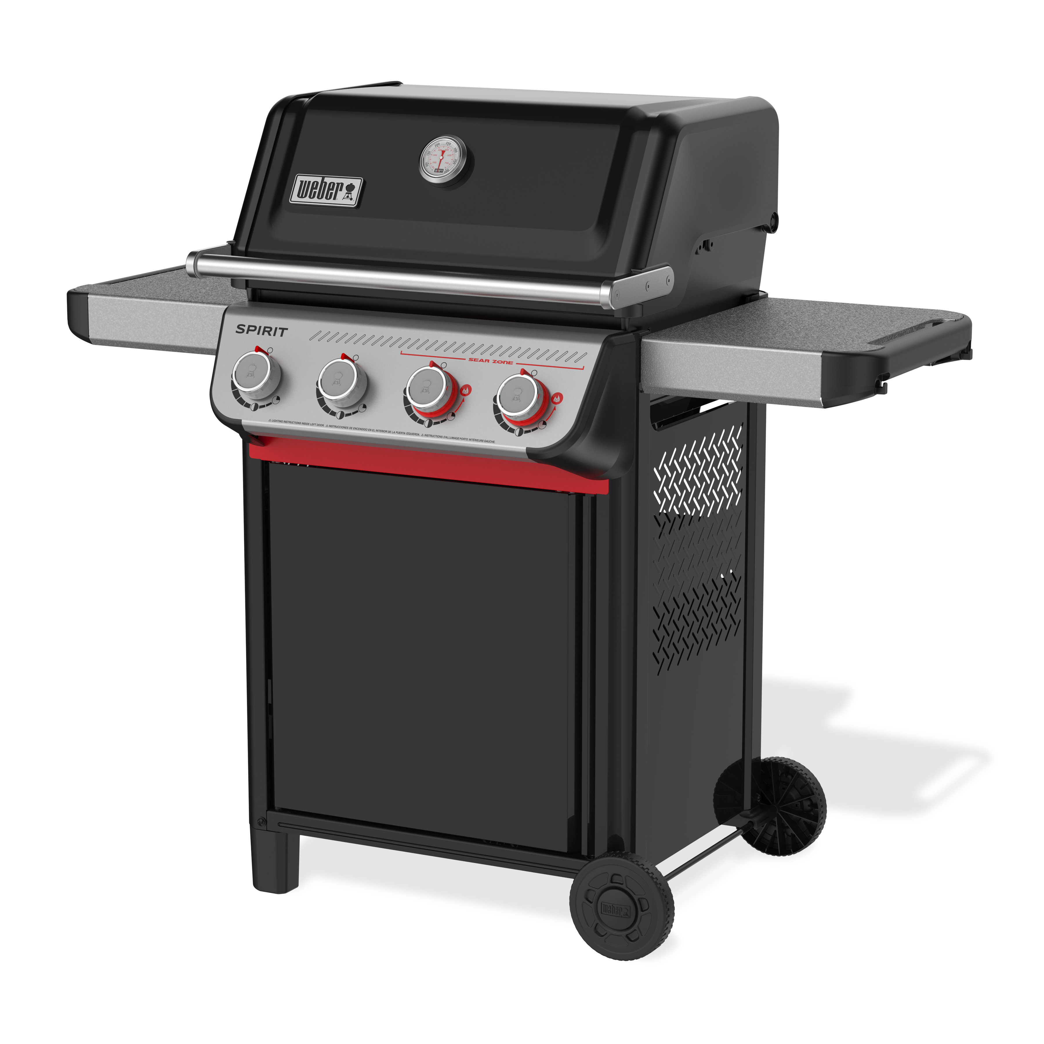 Grill food that tastes better than ever on the reinvented 4-burner Spirit® E-425 Gas Grill with Sear Zone. Create bold, flavourful sear marks on meat, fish, and vegetables with two red Boost Burner knobs that unleash 40% more power in the Sear Zone. Ignite each individual burner easily with one hand with Snap-Jet Ignition and control the heat precisely with a full range of temperatures from high to low and everything in between. Make the most of your space by adding a variety of Weber Works™ snap-on accessories (sold separately) to the side rails. Keep platters, seasonings, and tools within reach with side tables in a durable, scratch-resistant finish. Transform your grill into a griddle with a rust-resistant griddle insert (sold separately) or turn your grill into a pizza oven, wok, Dutch oven, and more by adding a Weber Crafted® frame kit and custom-fit grillware (each sold separately).
